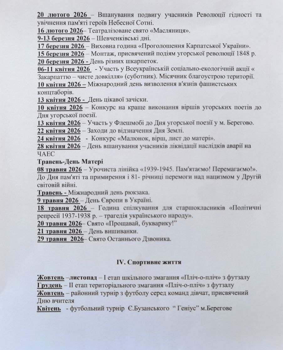 01–16 квітня 2026 – Участь у Всеукраїнській соціально-екологічній акції «Закарпаття – чисте довкілля» (суботник).
